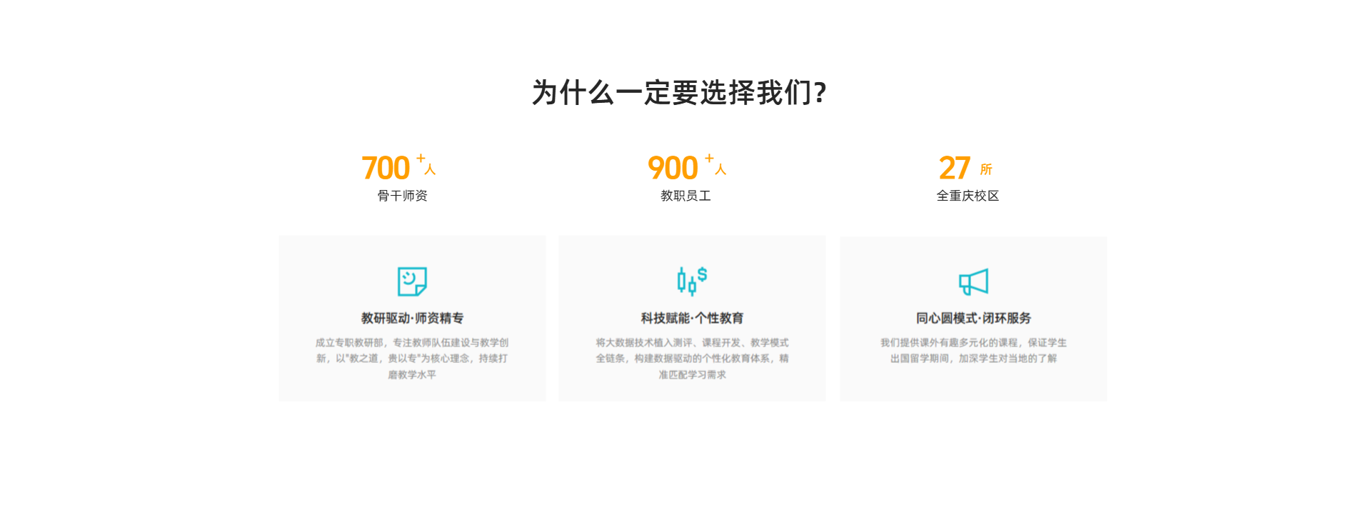 教之道,贵以专!创立之初就成立了教研部,教研部专注于教师队伍的建设,致力于教学方式的创新和教学水平的持续提升。将大数据等现代科学技术引入教学,植入学生测评、课程开发、教学模式搭建等各个环节,建立科技驱动下的个性化教育体系。运用现代心理学与行为学,从个性特征、心理特征、接受方式、年龄阶段、学习环境等因素发现西南地区孩子的学习需求,开创同心圆教学新模式(N对一,N对N教学模型)即从心理咨询出发,激活孩子求知欲,发掘自我动力;匹配个性化的学习方法, 专业老师系统辅导;专职班主任全程服务跟进,形成教育闭环。